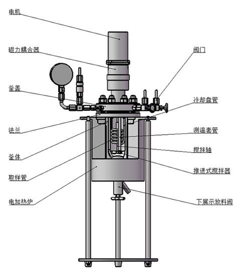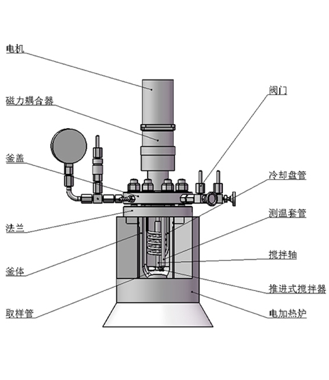 該結(jié)構(gòu)為端面磁力密封裝置,依靠兩塊強力磁鋼異極相吸的原理通過磁場穿透密封罩體來實現(xiàn)力矩的無接觸式傳遞,由于電機直接帶動攪拌器,故而其攪拌特點是低轉(zhuǎn)矩高轉(zhuǎn)速(≤1500r/min),適合攪拌低粘度(cp≤2000mpa.s)或固體顆粒物含量較少的反應物料介質(zhì)體系。