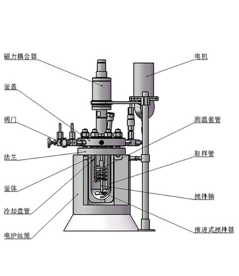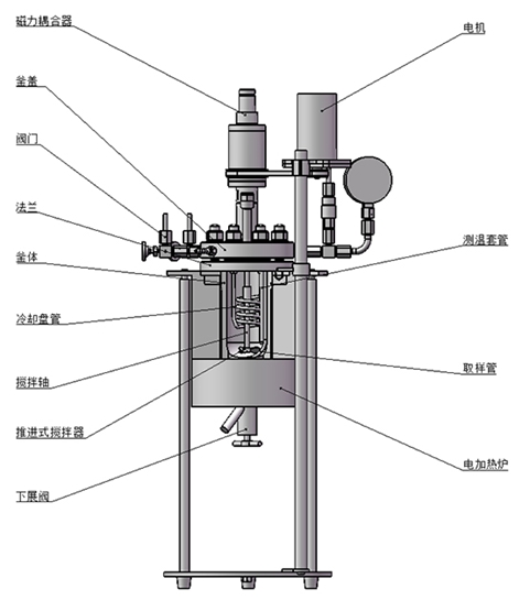 該結(jié)構(gòu)為環(huán)形磁力密封裝置,依靠兩組強(qiáng)力磁鋼異極相吸的原理通過磁場穿透密封罩體來實(shí)現(xiàn)力矩的無接觸式傳遞,由于電機(jī)經(jīng)過皮帶二級減速,故而其攪拌特點(diǎn)是大轉(zhuǎn)矩低轉(zhuǎn)速(≤750r/min),適合攪拌中高粘度(cp≥5000mpa.s)或固體顆粒含量較多的反應(yīng)物料介質(zhì)體系。
